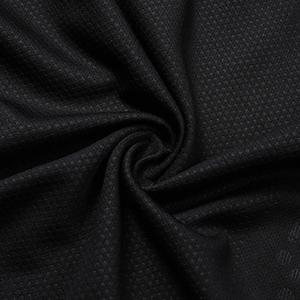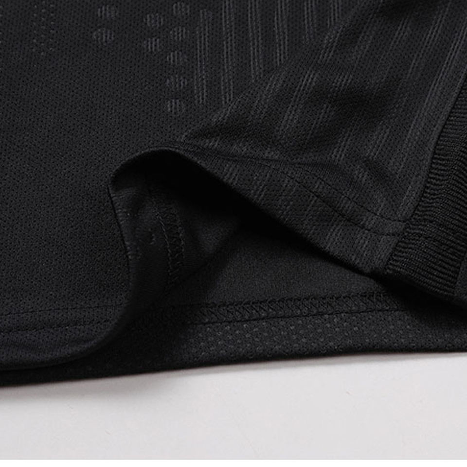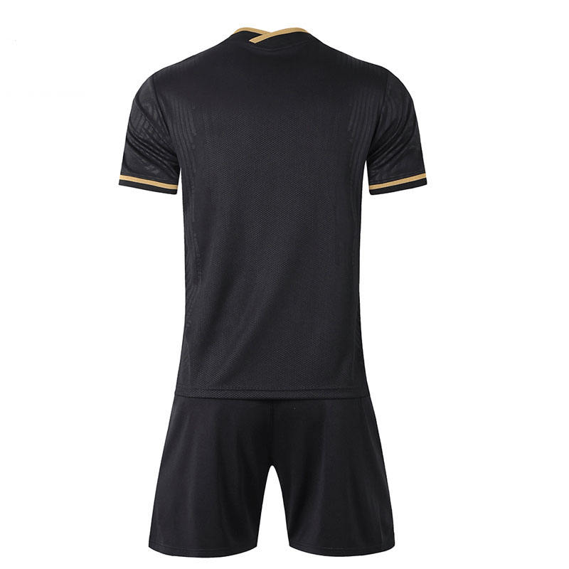 ชุดเสื้อฟุตบอลสีดำเรียบแบบกำหนดเอง กางเกงขาสั้นแต่งขอบสีทอง แห้งเร็ว ระบายอากาศได้ดี น้ำหนักเบา ชุดกีฬาฟุตบอลสำหรับทีม ชุดกีฬาฤดูร้อน