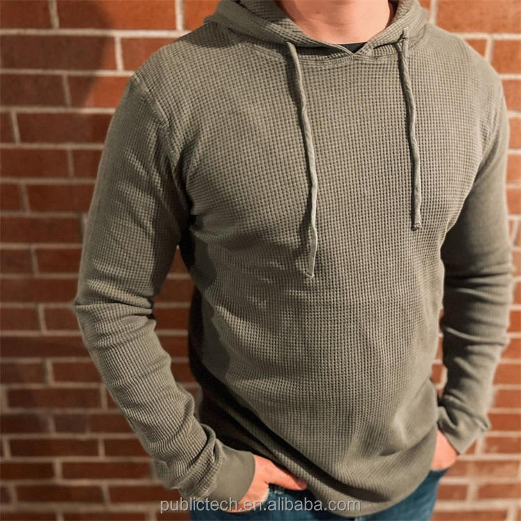 เสื้อฮู้ดและสเวตเตอร์ของผู้ชายแบบธรรมดาออกแบบได้ตามต้องการมีฮู้ดแบบถักวาฟเฟิลสำหรับฤดูใบไม้ผลิน้ำหนักเบา