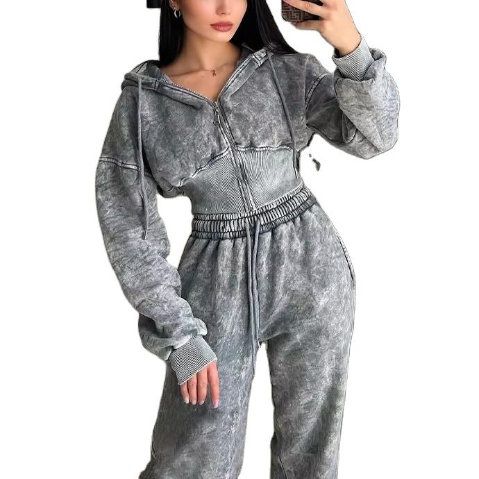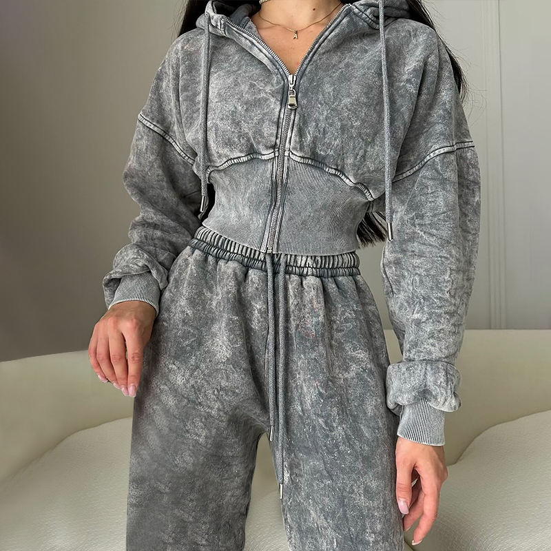 Custom Plus Size Cotton Fleece Ladies 2 Piece Hoodie Set Women's Distressed Acid Washed Zip up Crop Top Hoodies and Joggers Set