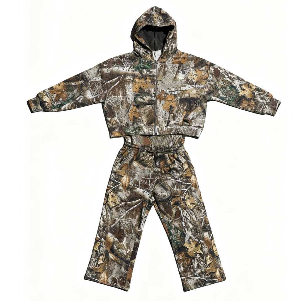 ชุดแทรคสูทลายพรางแบบมีฮู้ดและกางเกงขายาวทรงบาน ตกแต่งด้วยคริสตัล สำหรับผู้ชายไซส์พลัส ลายพิมพ์ Y2K สไตล์สตรีทแวร์