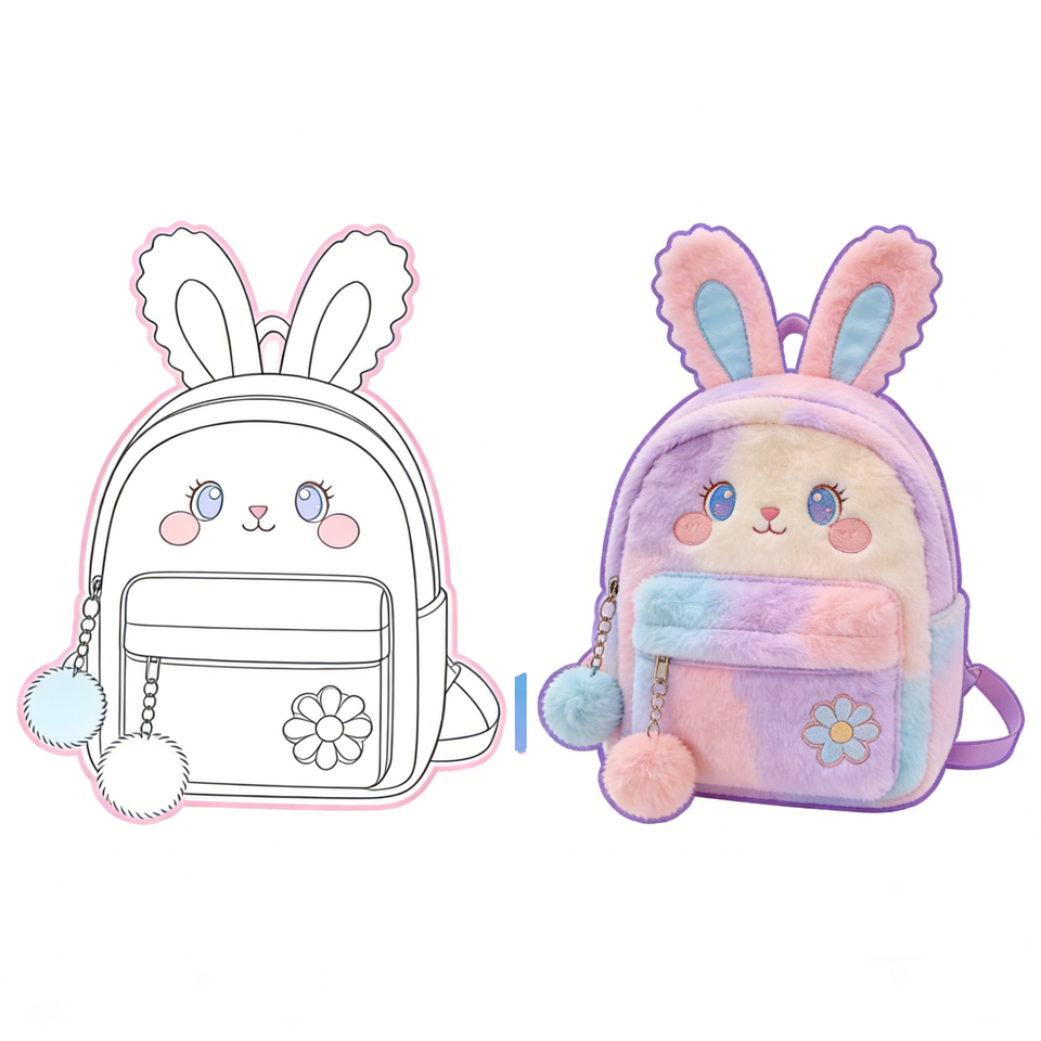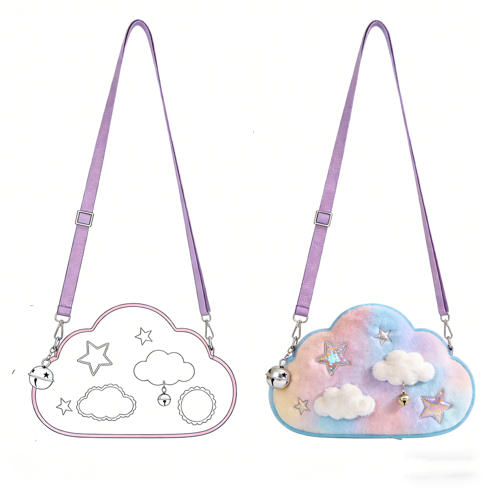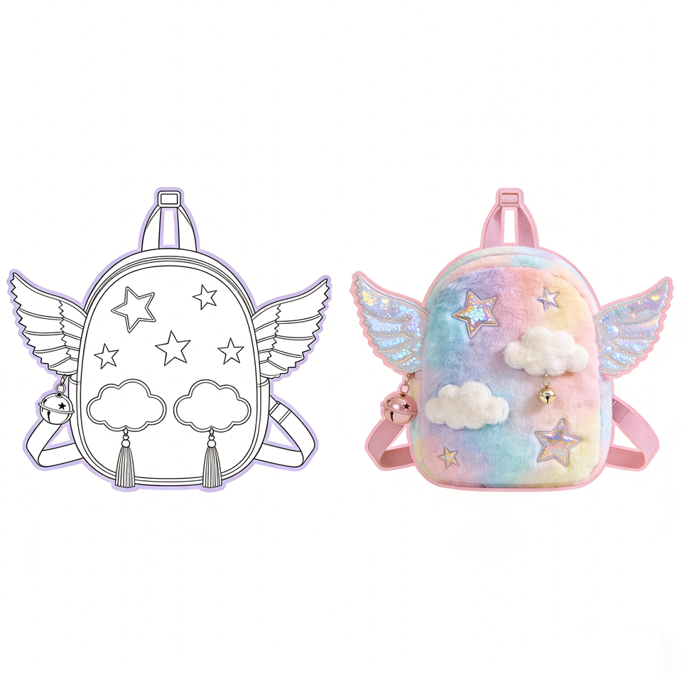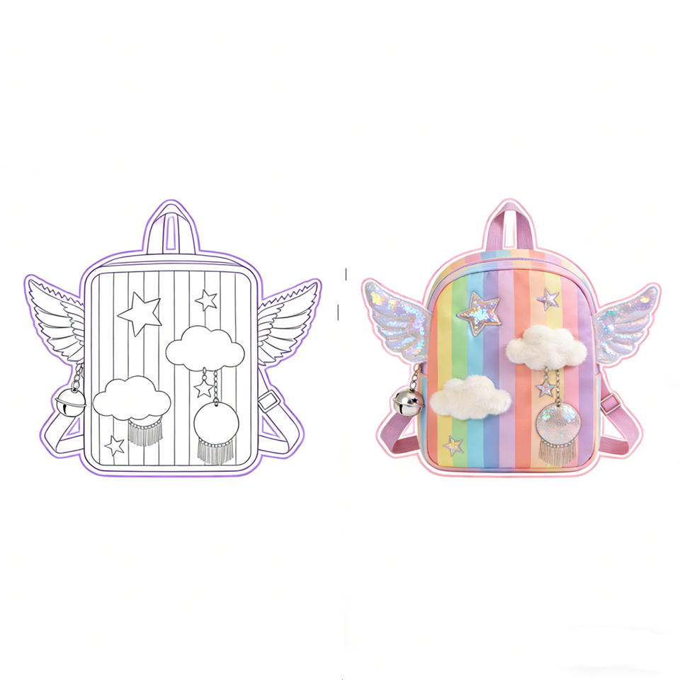 กระเป๋าเป้สะพายหลังลายสายรุ้งแบบกำหนดเอง พร้อมปีกนางฟ้า เมฆ และจี้รูปดาว ดีไซน์การ์ตูนแปลงร่างเป็นกระเป๋าตุ๊กตา