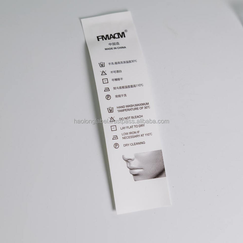 ป้ายผ้าโพลีเอสเตอร์พิมพ์ลายซักได้พร้อมโลโก้ยี่ห้อและคำแนะนำในการซักเสื้อผ้า