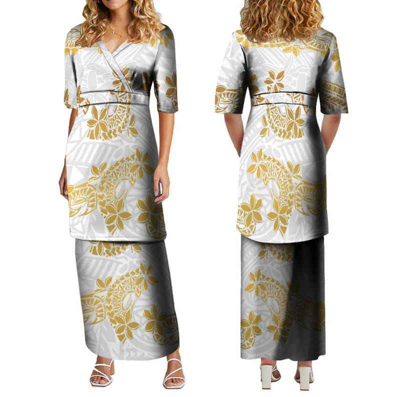 ชุดเดรสสองชิ้นแบบโพลีนีเชียนลายชนเผ่าแบบกำหนดเอง ลายซามัว ปูเลตาซี คอวี แขนครึ่งแขน สำหรับผู้หญิง
