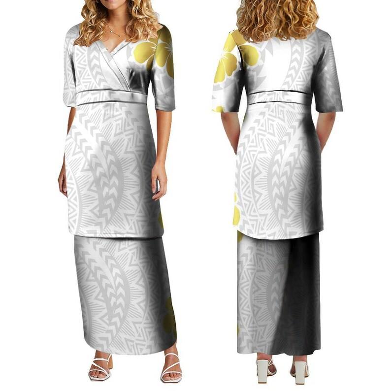 ชุดเพลตตาซีแบบโพลีนีเชียนลายชนเผ่าซามัว คอวี แขนครึ่งแขน ชุดสองชิ้นสำหรับผู้หญิง