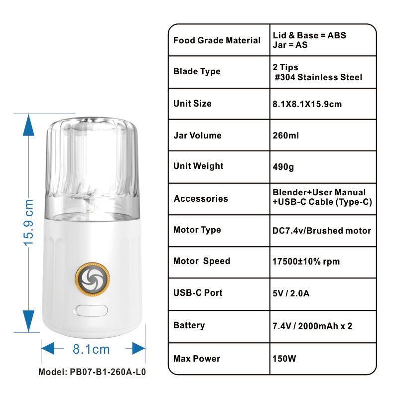 เครื่องปั่นพกพาแบบกำหนดเอง 260 มล. เครื่องเตรียมอาหารเด็ก เครื่องปั่นสมูทตี้ ใช้แบตเตอรี่ ชาร์จผ่าน USB ปลอดสาร BPA เสียงเบา กดปุ่มเดียว ขายส่ง