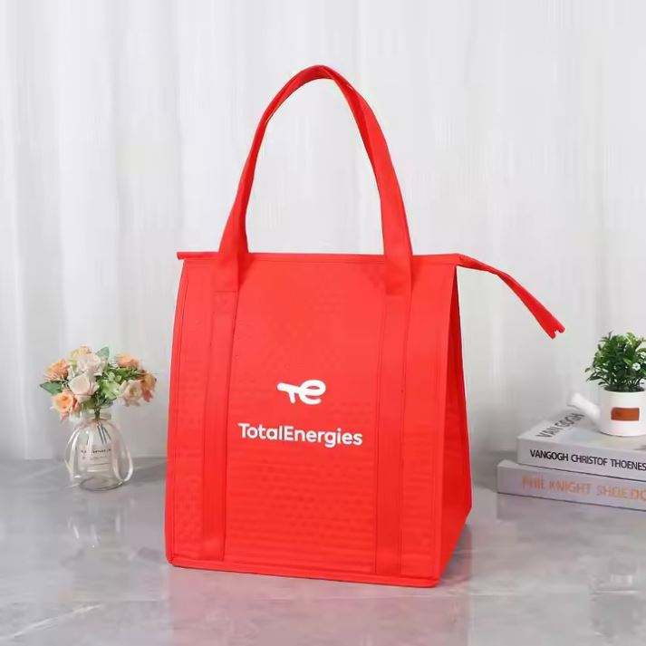 กระเป๋าใส่อาหารแบบพกพาสีแดง ไม่มีลวดลาย ทำจากผ้าไม่ถักทอ ช่วยรักษาอุณหภูมิ ใช้ซ้ำได้ เก็บความร้อนและความเย็น