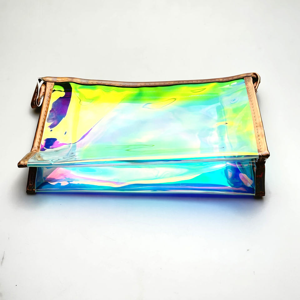 กระเป๋าใส่อุปกรณ์อาบน้ำแบบพกพา โปร่งใส ลายโฮโลแกรม PVC แฟชั่น ซิปกันน้ำ พร้อมลายเลเซอร์