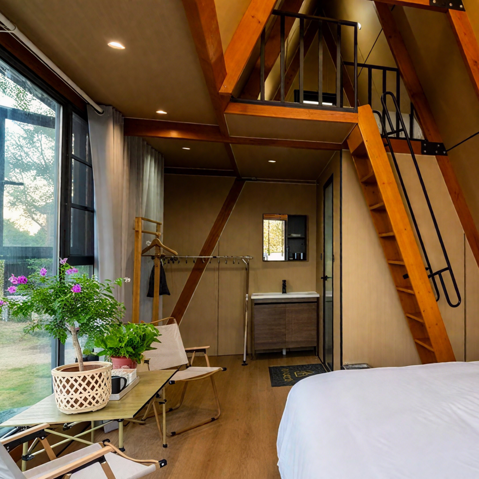 โครงสร้างเหล็กชุบสังกะสีแบบพับได้โครงสร้างห้องโดยสารบ้านทรงสามเหลี่ยมออกแบบกันน้ำได้อย่างมีประสิทธิภาพพลังงานสำหรับ Airbnb หรือบ้านขนาดเล็กตามต้องการ