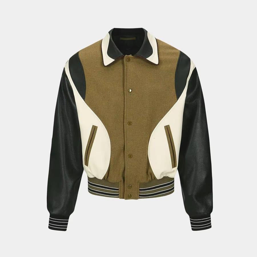 แจ็คเก็ตเบสบอลพรีเมียมแบบกำหนดเอง แจ็คเก็ตกันลมสไตล์แพทช์เวิร์คสุดเท่ พร้อมแขนหนัง
