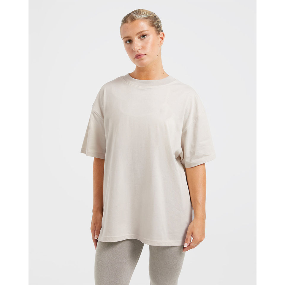 เสื้อยืดโอเวอร์ไซส์สีเบจพรีเมียมสำหรับผู้หญิง แขนสั้น เนื้อผ้านุ่มพิเศษ น้ำหนักเบา ดีไซน์สวย ทรงหลวม ใส่สบาย เหมาะสำหรับออกกำลังกาย