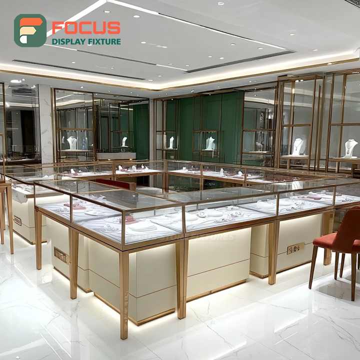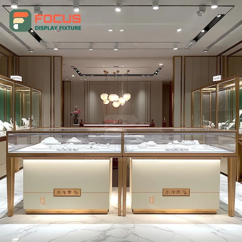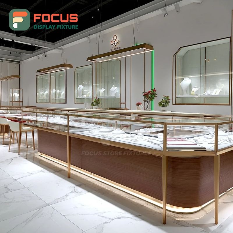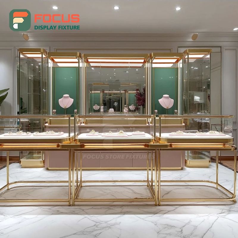 ตู้โชว์กระจกสำหรับร้านค้าแบรนด์ดัง พร้อมอุปกรณ์ตกแต่งร้านค้าปลีกเครื่องประดับพรีเมียมแบบกำหนดเอง พื้นผิวขัดเงา