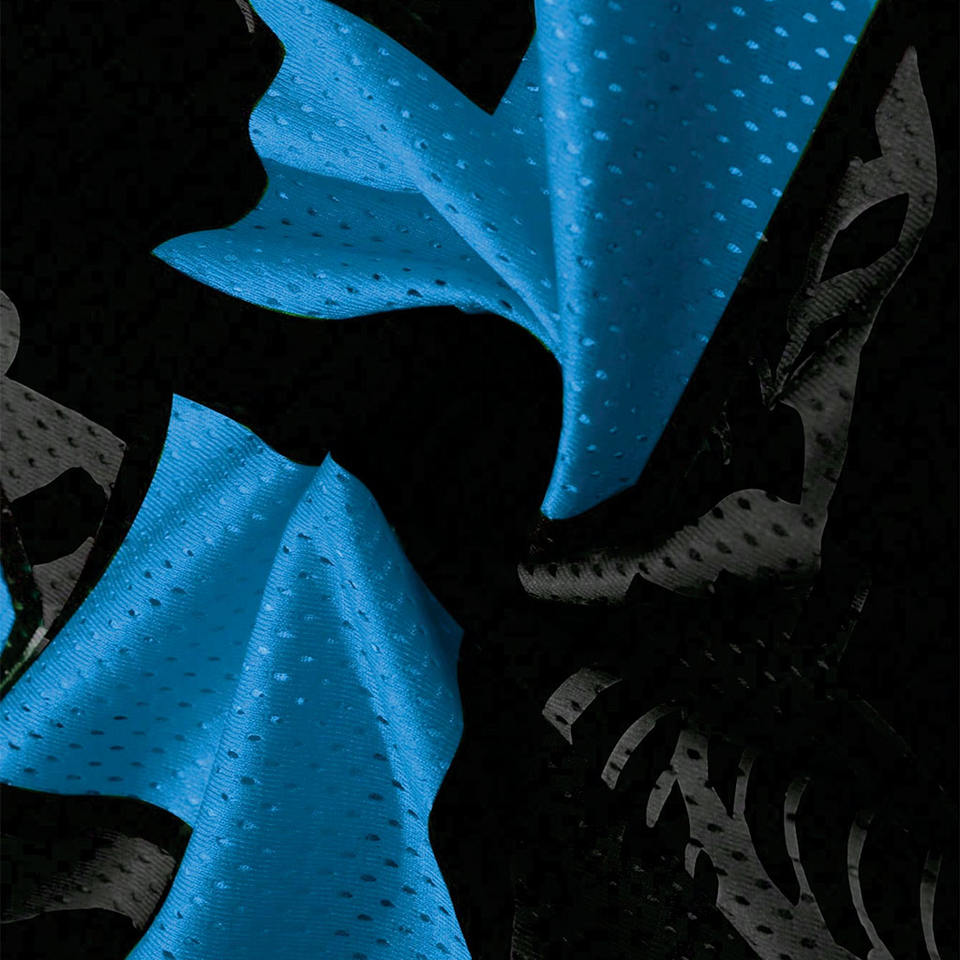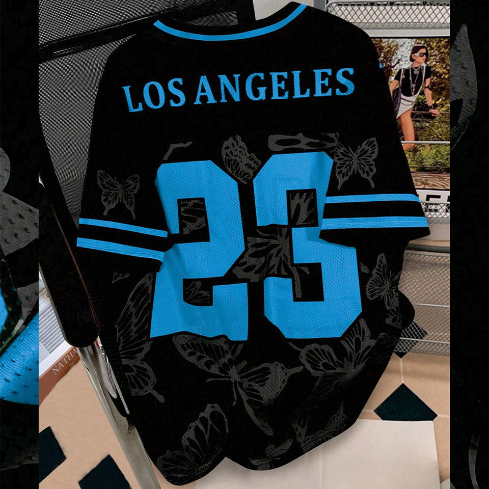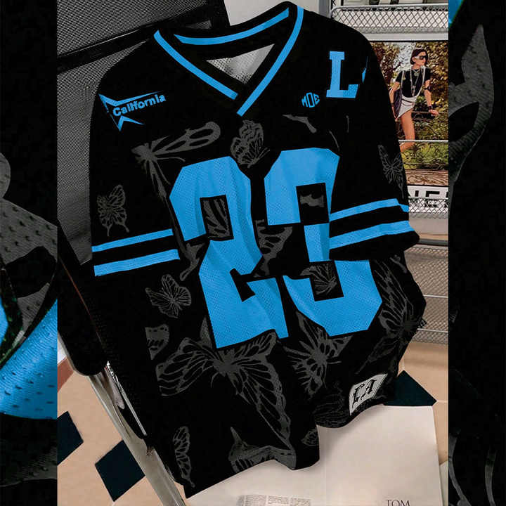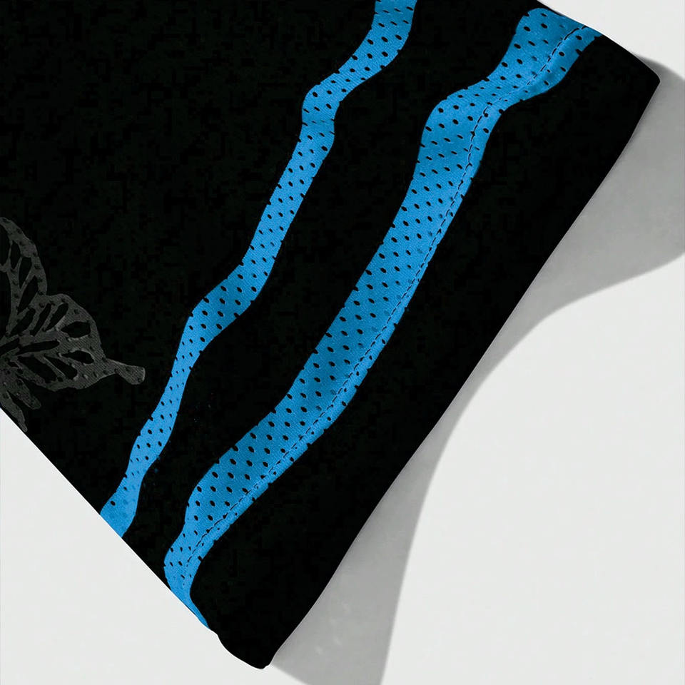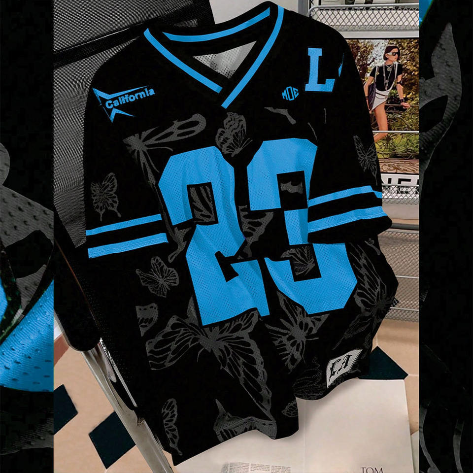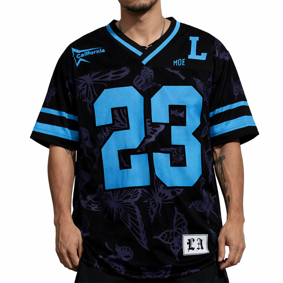เสื้อฟุตบอลตาข่ายสีดำน้ำเงินพิมพ์ลายผีเสื้อทรงโอเวอร์ไซส์คุณภาพพรีเมียมสั่งทำพิเศษ เสื้อยืดสตรีทแวร์สำหรับทุกเพศทุกวัย ขายส่งแบบ OEM