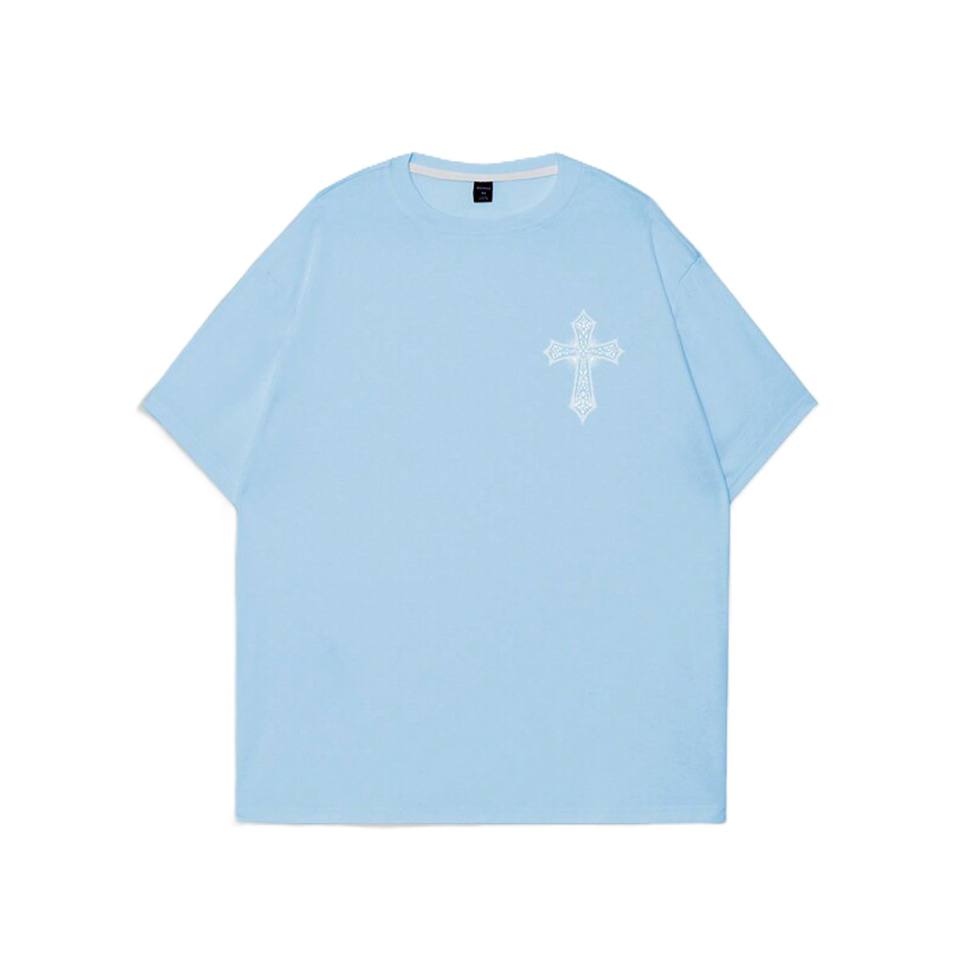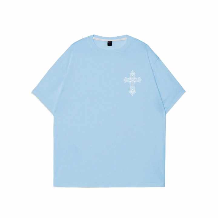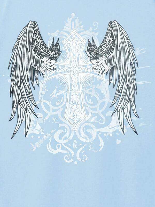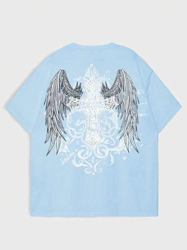 เสื้อเชิ้ตผู้ชายพิมพ์ลายปีกนางฟ้าแบบกำหนดเอง เสื้อยืดโอเวอร์ไซส์ผ้าฝ้ายนุ่มสำหรับผู้ชาย สีฟ้าอ่อน สตรีทแวร์ เสื้อผ้าลำลอง