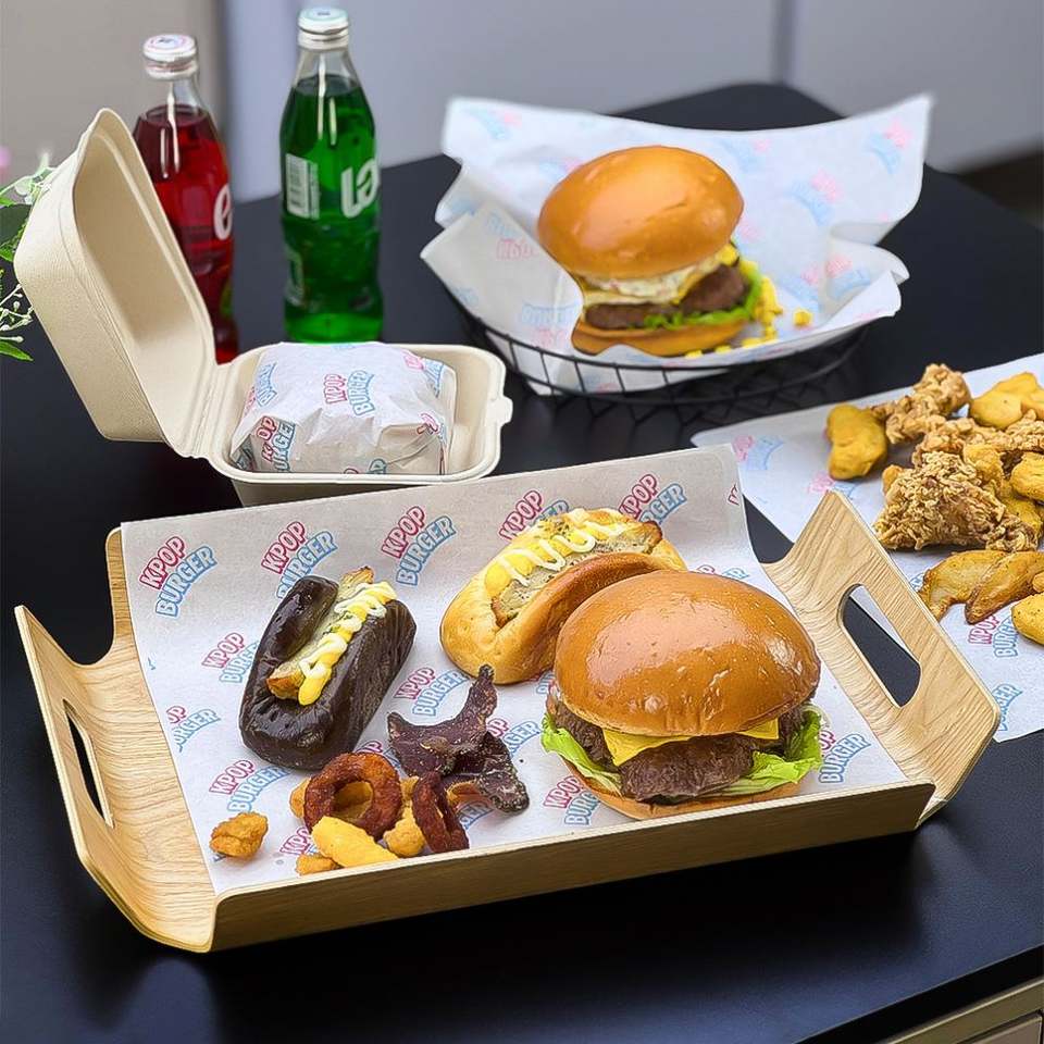 ถาดกระดาษใส่อาหารเป็นมิตรกับสิ่งแวดล้อมเกรดอาหารกระดาษห่อกันไขมันสำหรับบรรจุภัณฑ์เบอร์เกอร์แซนวิช