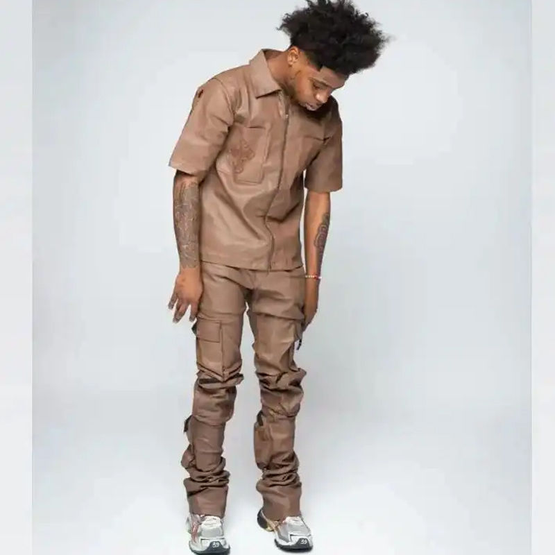 ชุดแจ็คเก็ตหนังปักลายพิมพ์ตามสั่งสำหรับผู้ชาย พร้อมกางเกงขายาวทรงบานแบบซ้อนทับ ชุดแทรคสูทหนังสำหรับผู้ชาย