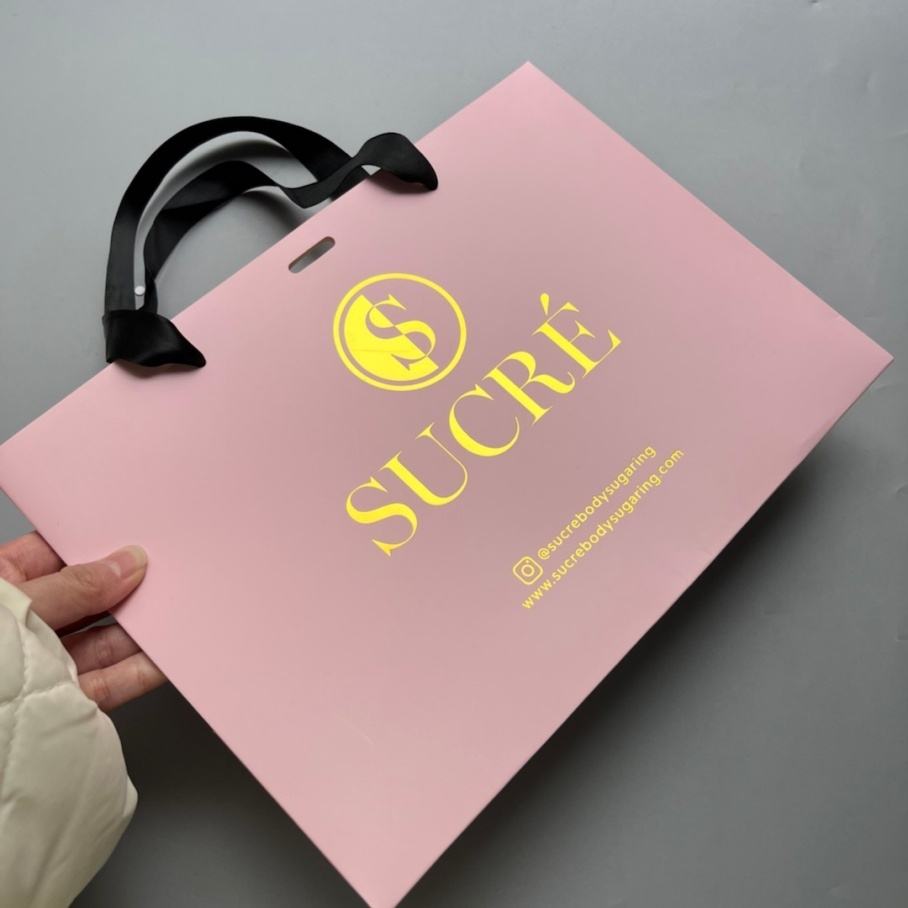 ถุงกระดาษช้อปปิ้งของขวัญพิมพ์โลโก้สีทองแบบกำหนดเอง แบรนด์หรูหรา ปั๊มร้อน สีชมพู รีไซเคิลได้ สำหรับเสื้อผ้าและเครื่องประดับ