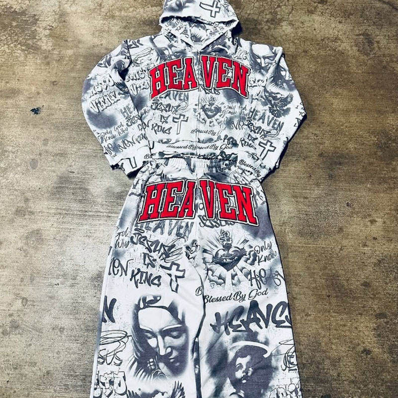 ชุดเซ็ตสเวตสูทพิมพ์ลายแบบกำหนดเอง ล้างสีแบบแอซิดวอช แต่งดีเทลขาดๆ สำหรับผู้ชาย เอวสองชั้น สไตล์สตรีทแวร์ เสื้อฮู้ดดี้และกางเกงจ็อกเกอร์