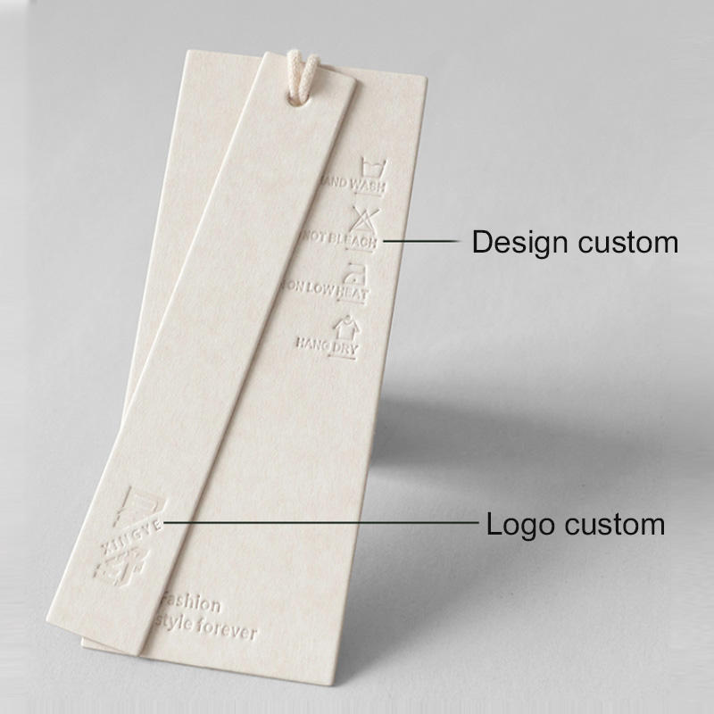 ป้ายแขวนแบบนูนสำหรับกระเป๋าเสื้อผ้ากระดาษแข็งมีสายกระดาษรีไซเคิลดีไซน์พิมพ์ลายออกแบบได้ตามต้องการ