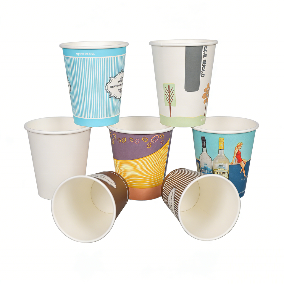 แก้วกระดาษสังเคราะห์แบบใช้แล้วทิ้ง พิมพ์ลายได้ตามต้องการ ขนาด 4, 8, 10, 12, 16 ออนซ์ ขายส่งแก้วเครื่องดื่ม