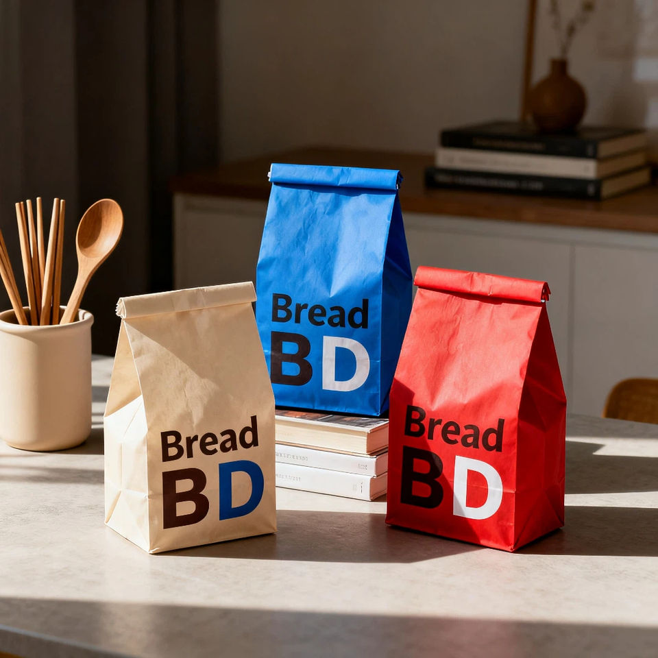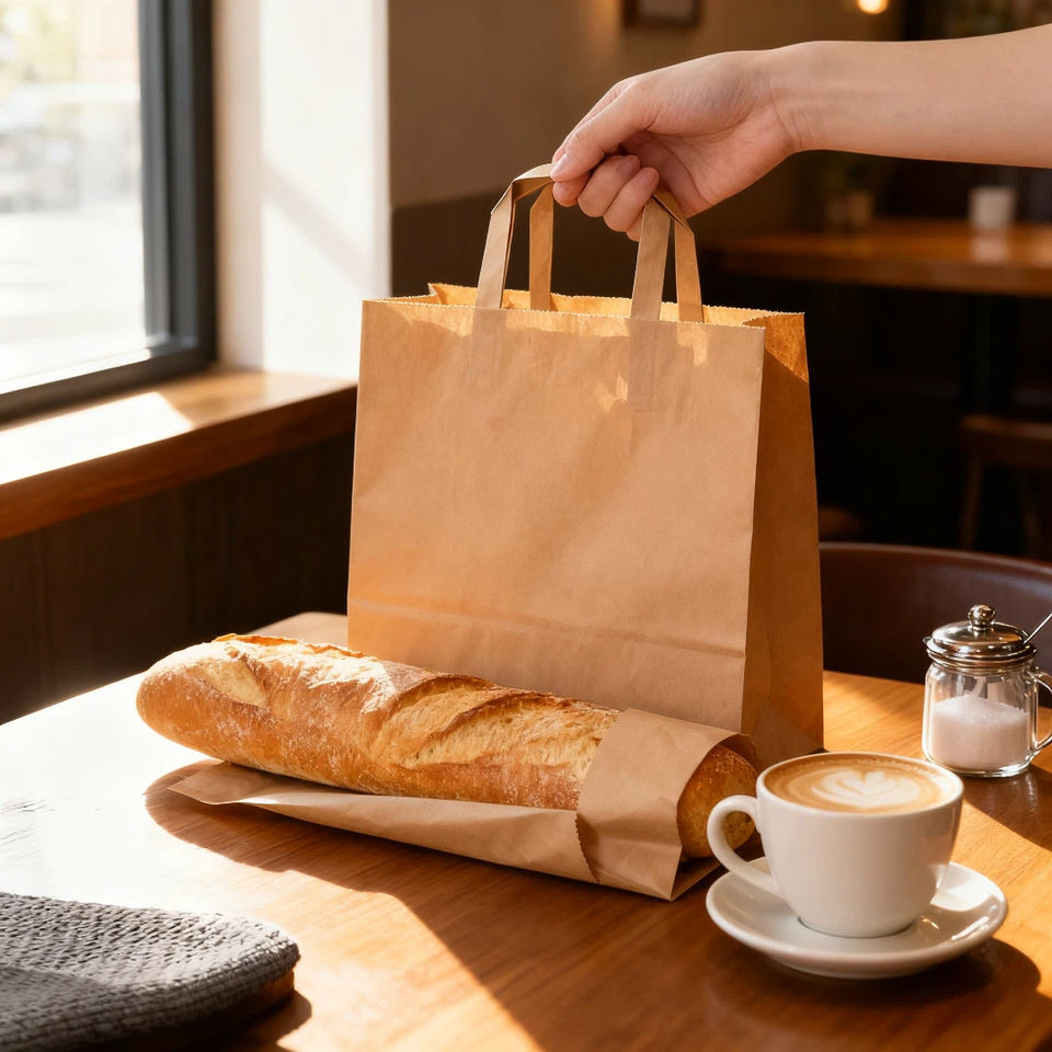 ถุงขนมปังกระดาษคราฟท์กันความชื้นพิมพ์ลายแบบกำหนดเองเป็นมิตรกับสิ่งแวดล้อมพร้อมตัวเลือกการลบและด้ามจับสำหรับบรรจุภัณฑ์อาหาร