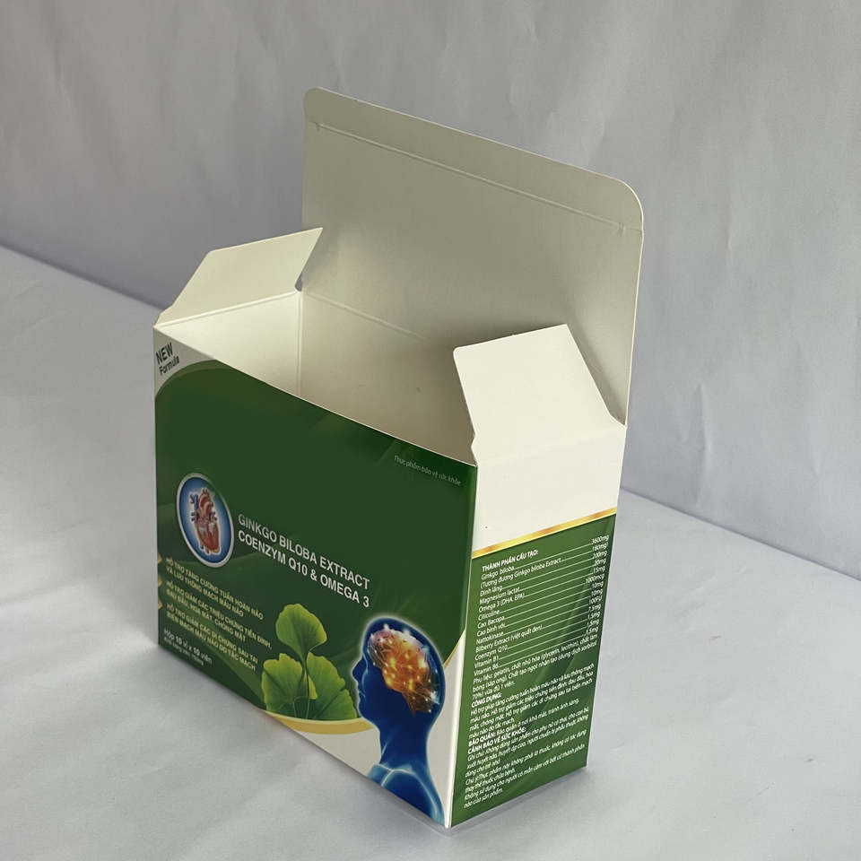 กล่องบรรจุภัณฑ์กระดาษสีเขียวพิมพ์ลายตามสั่ง สำหรับสารสกัดจากแปะก๊วยและอาหารเสริมโอเมก้า 3 กล่องเปล่า