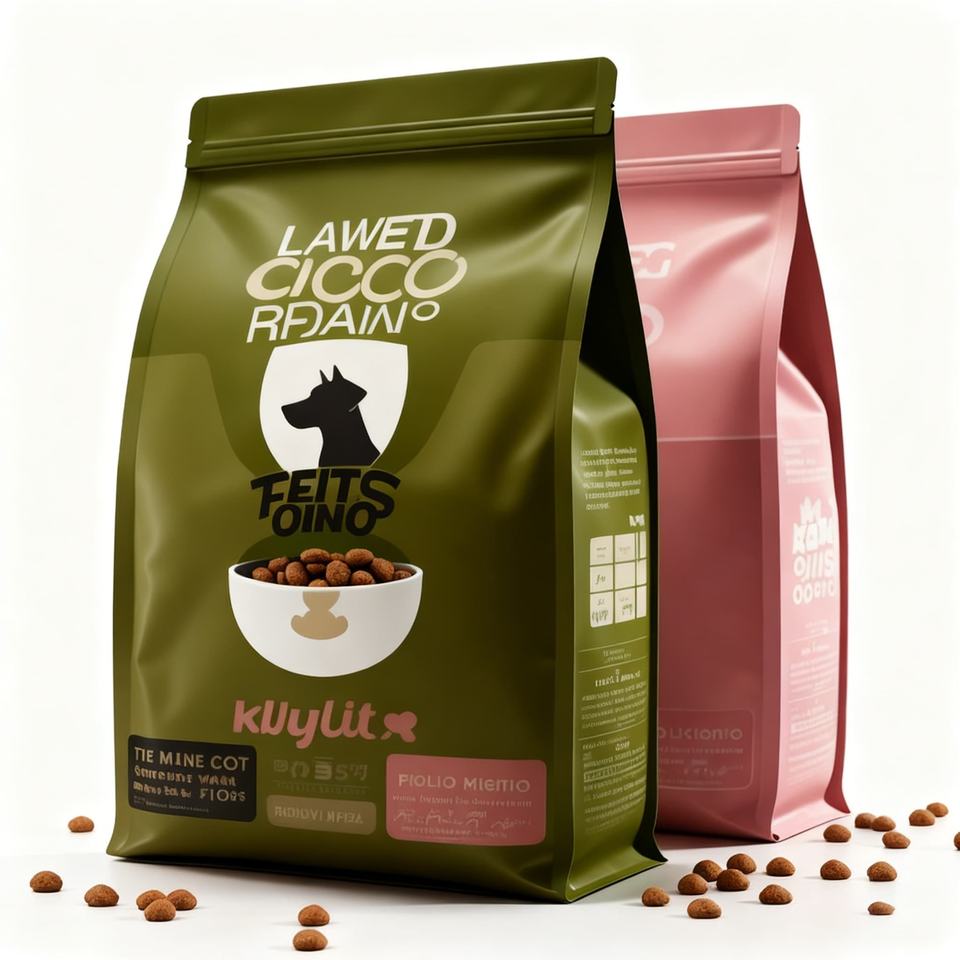 ถุงบรรจุภัณฑ์อาหารสัตว์เลี้ยงแบบตั้งได้ ก้นแบน ขนาด 5-25 กก. ผลิตจากพลาสติก ปิดผนึกด้วยซิปล็อค ป้องกันความชื้น พิมพ์ลายได้ตามต้องการ