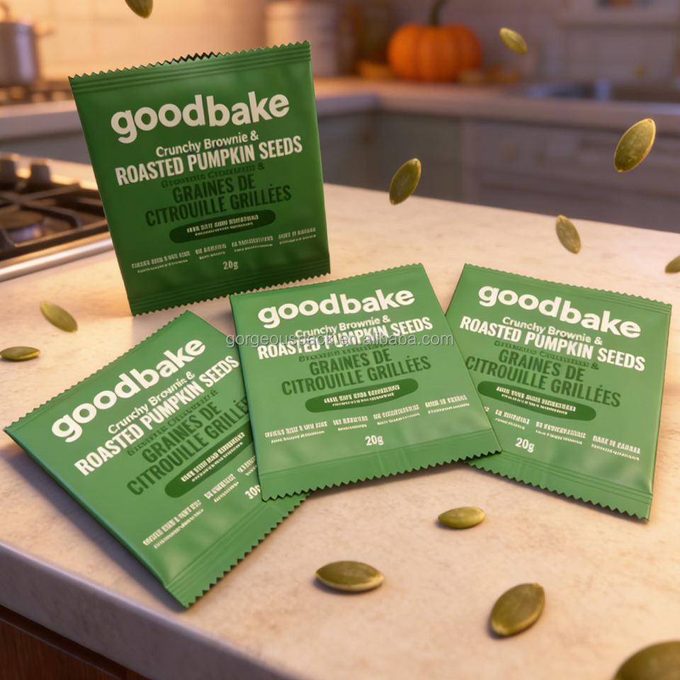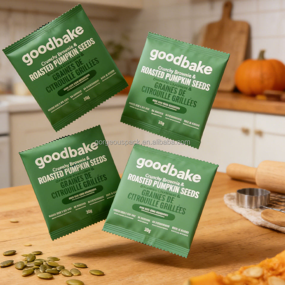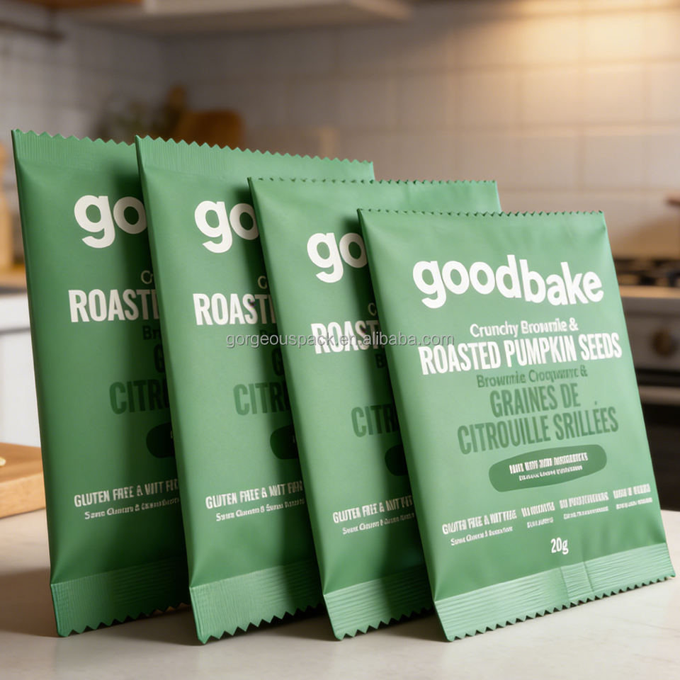 ถุงซีลกลางแบบพิมพ์ลายเองสำหรับบรรจุเมล็ดพืช โปรตีนซีเรียล ถั่วแท่ง ช็อกโกแลตบาร์ คุกกี้ เยลลี่ และลูกอม