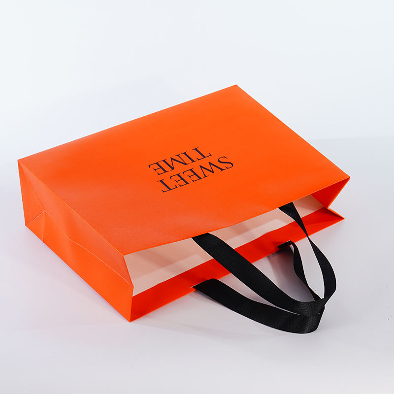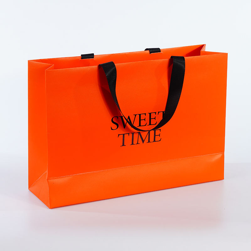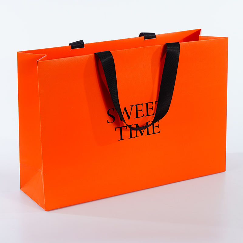 ถุงของขวัญสุดหรูสำหรับร้านขายเสื้อผ้า พิมพ์โลโก้ตามสั่ง ปั๊มฟอยล์สีแดงทอง กระดาษเคลือบด้าน ปรับแต่งได้