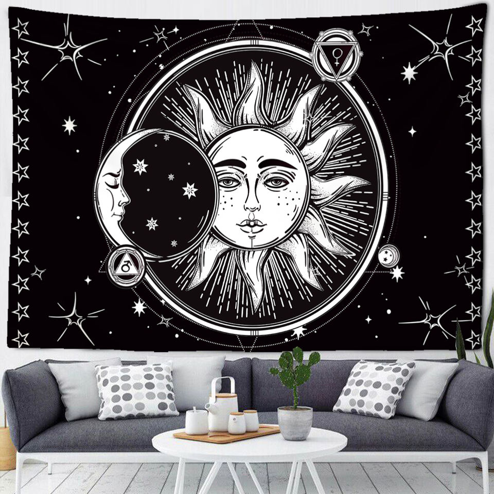 ผ้าแขวนผนังลายแมนดาลาพิมพ์ลายเอง สีขาวดำ ลายพระอาทิตย์และพระจันทร์ สำหรับตกแต่งห้องพักสไตล์ฮิปปี้ ผ้าห่มตกแต่ง