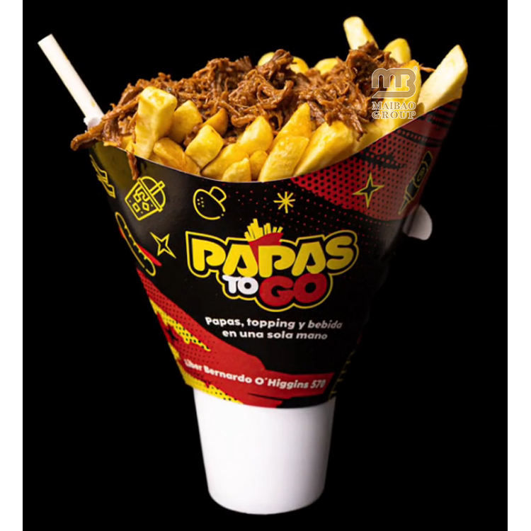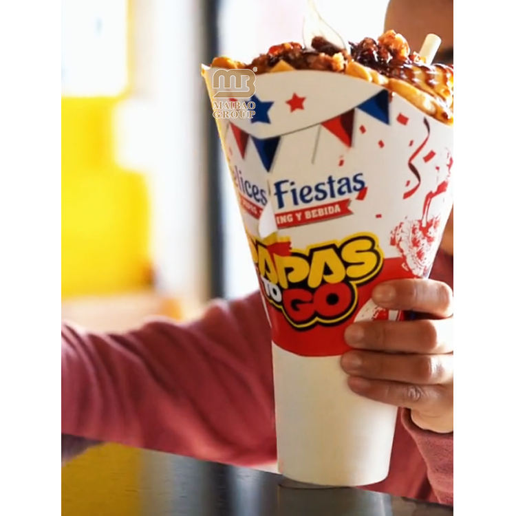 พัดกระดาษพิมพ์ลายตามสั่ง สำหรับใส่แก้วอาหารร้อนแบบใช้แล้วทิ้ง ที่ใส่เฟรนช์ฟรายส์แบบกรวยกระดาษ ที่ใส่ปาปาสฟริตัส ขนมขบเคี้ยวและแก้วเครื่องดื่ม 2 in 1