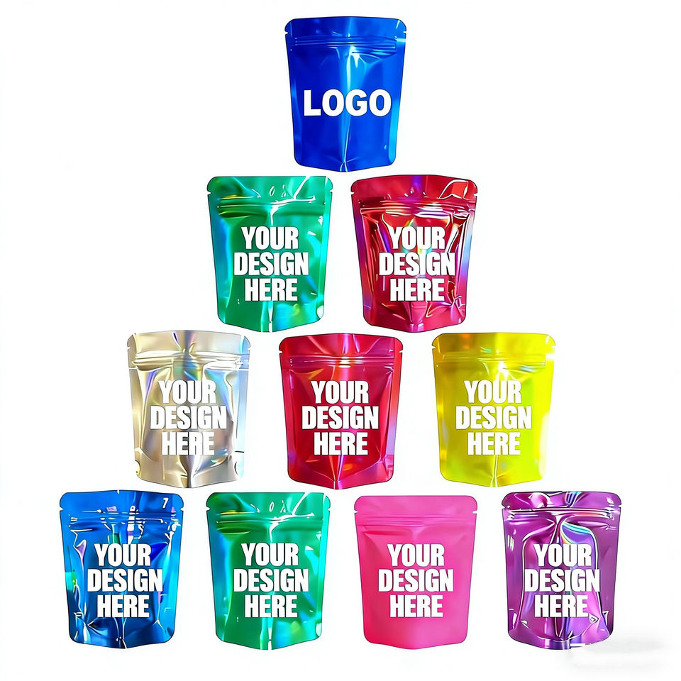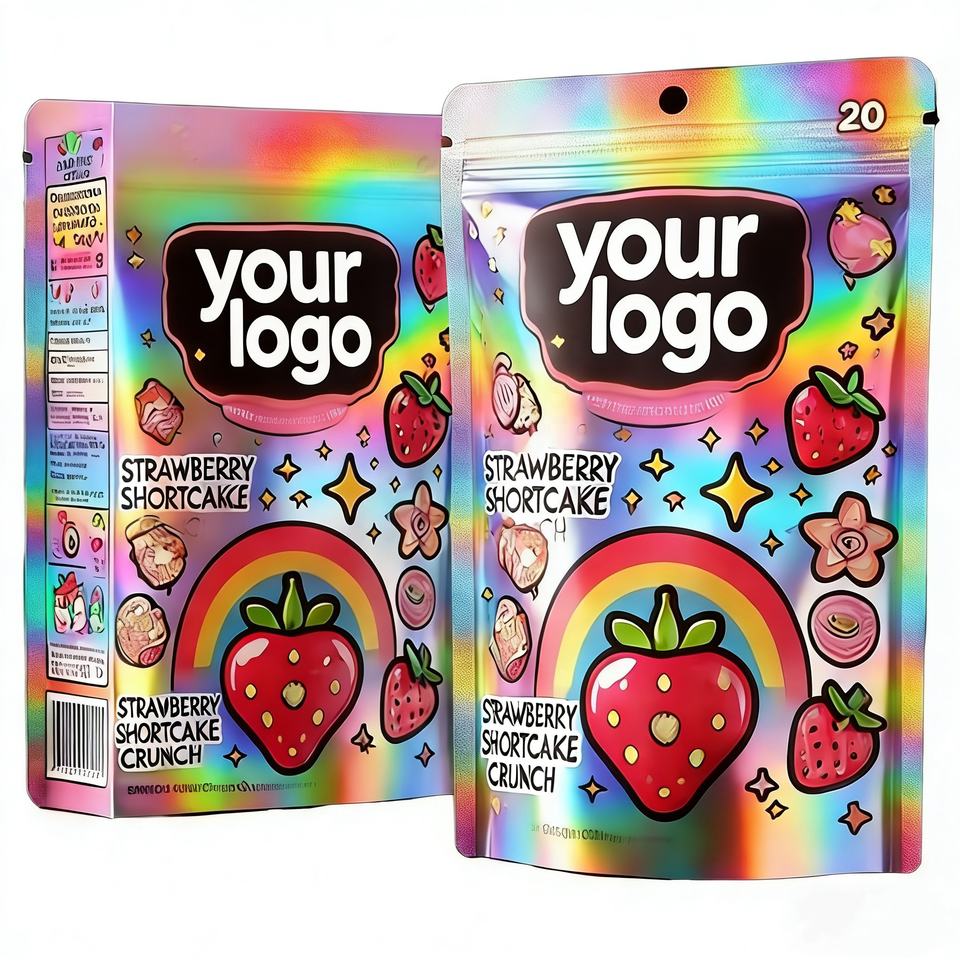 ถุงพลาสติกแบบมีซิปล็อคพิมพ์ลายโฮโลแกรมสีรุ้งสำหรับบรรจุขนม ของว่าง และอาหารสัตว์เลี้ยง