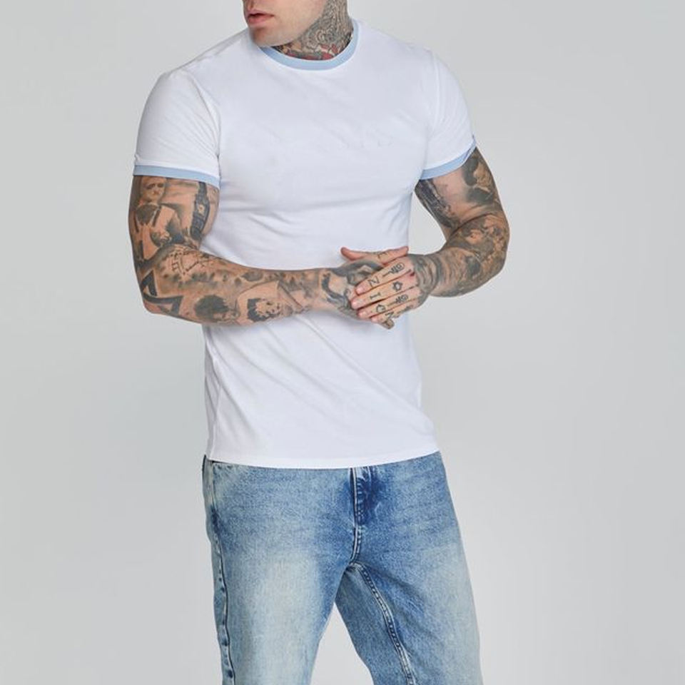 เสื้อยืดคอกลมแขนสั้นสำหรับผู้ชายเสื้อยืดคอกลมสีทึบพิมพ์ลายโลโก้ข้อความออกแบบได้ตามต้องการ