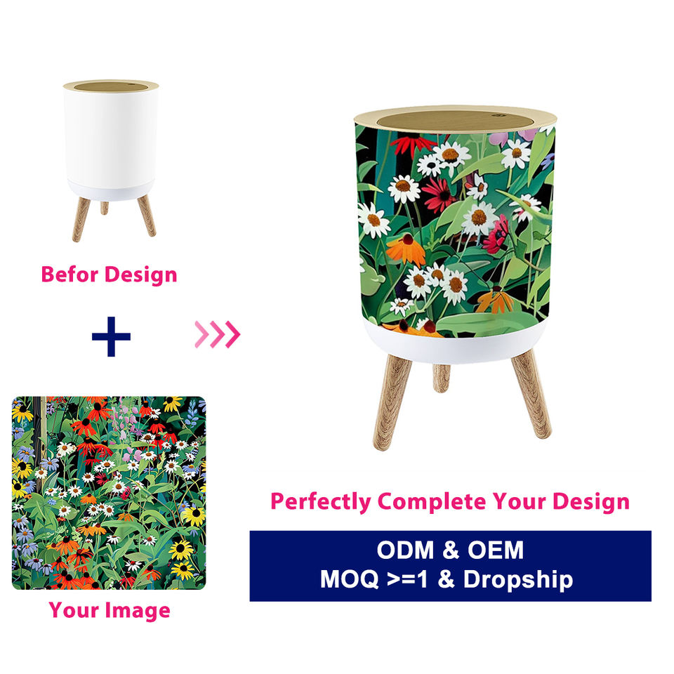 ถังขยะขนาดเล็กทรงกระบอกทรงกลมพิมพ์ลายได้ตามต้องการเฟอร์นิเจอร์ส่วนตัวสำหรับตกแต่งห้องครัวห้องน้ำ