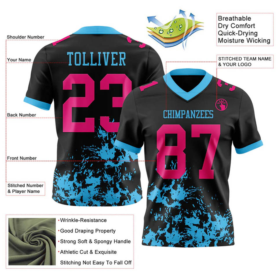 เสื้อฟุตบอลอเมริกันแขนสั้นพิมพ์ลายตามสั่ง ผ้าโพลีเอสเตอร์ 100% ระบายอากาศได้ดี ป้องกันแบคทีเรีย ป้องกันรังสียูวี มีไซส์ใหญ่พิเศษ ด้านหน้า