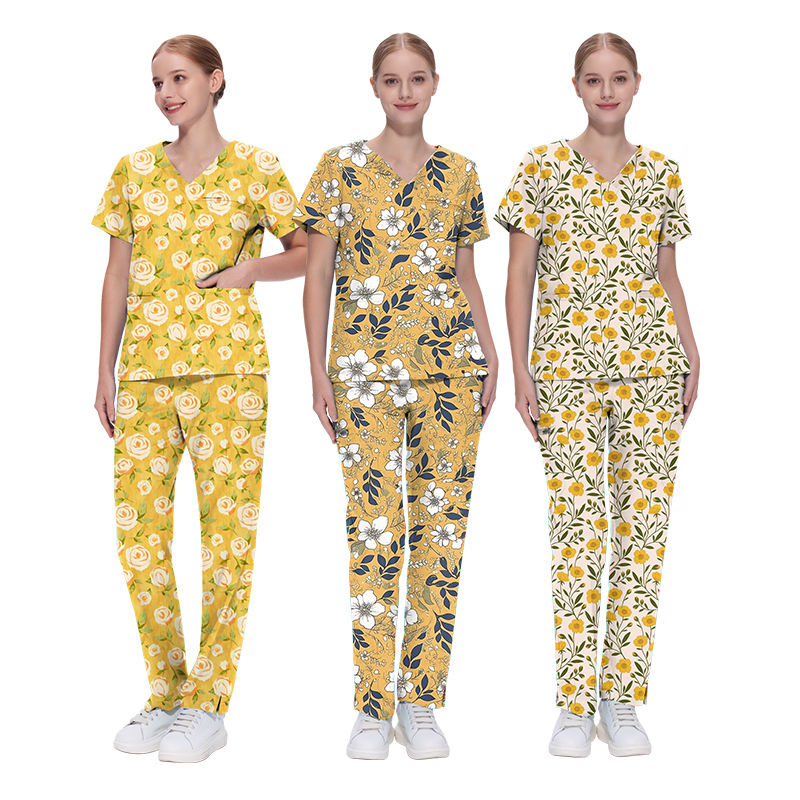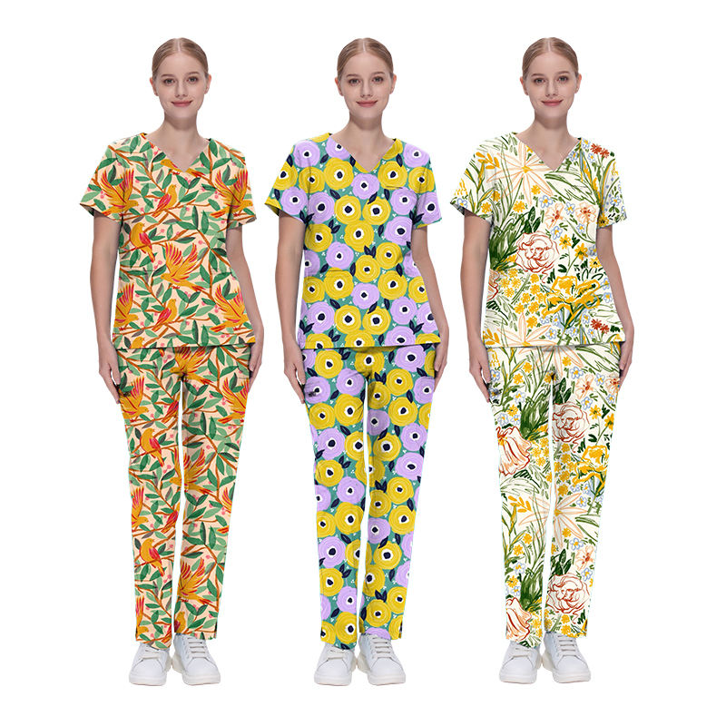 ชุดขัดชุดเครื่องแบบพยาบาลทางการแพทย์ชุดเสื้อผ้าผ้าฝ้ายสีสันสดใสคอวีพิมพ์ลายได้ตามต้องการ