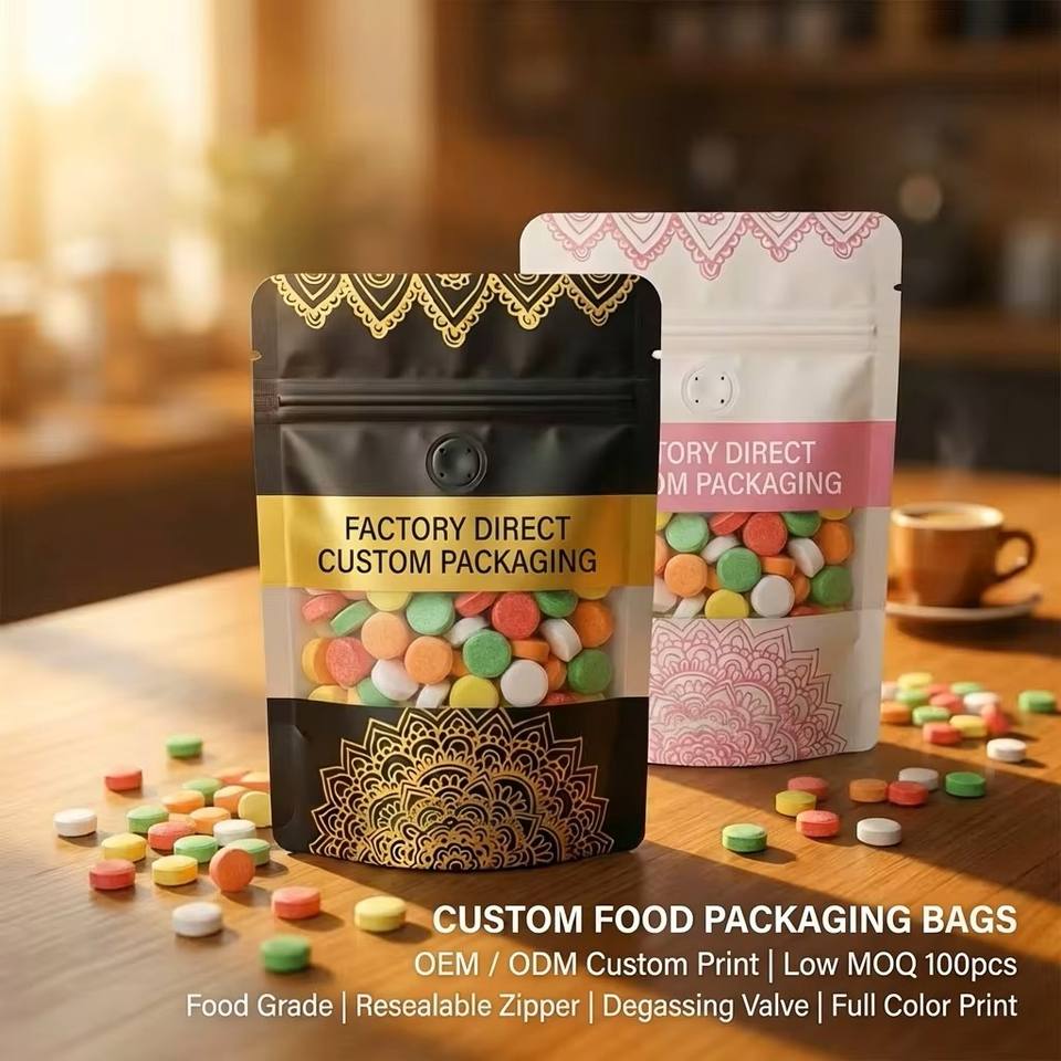 ถุงซิปล็อคแบบตั้งได้ พิมพ์ลายตามสั่ง เกรดอาหาร ปิดผนึกได้ ถุงบรรจุภัณฑ์ไมลาร์ MOQ ต่ำ โลโก้สั่งทำได้