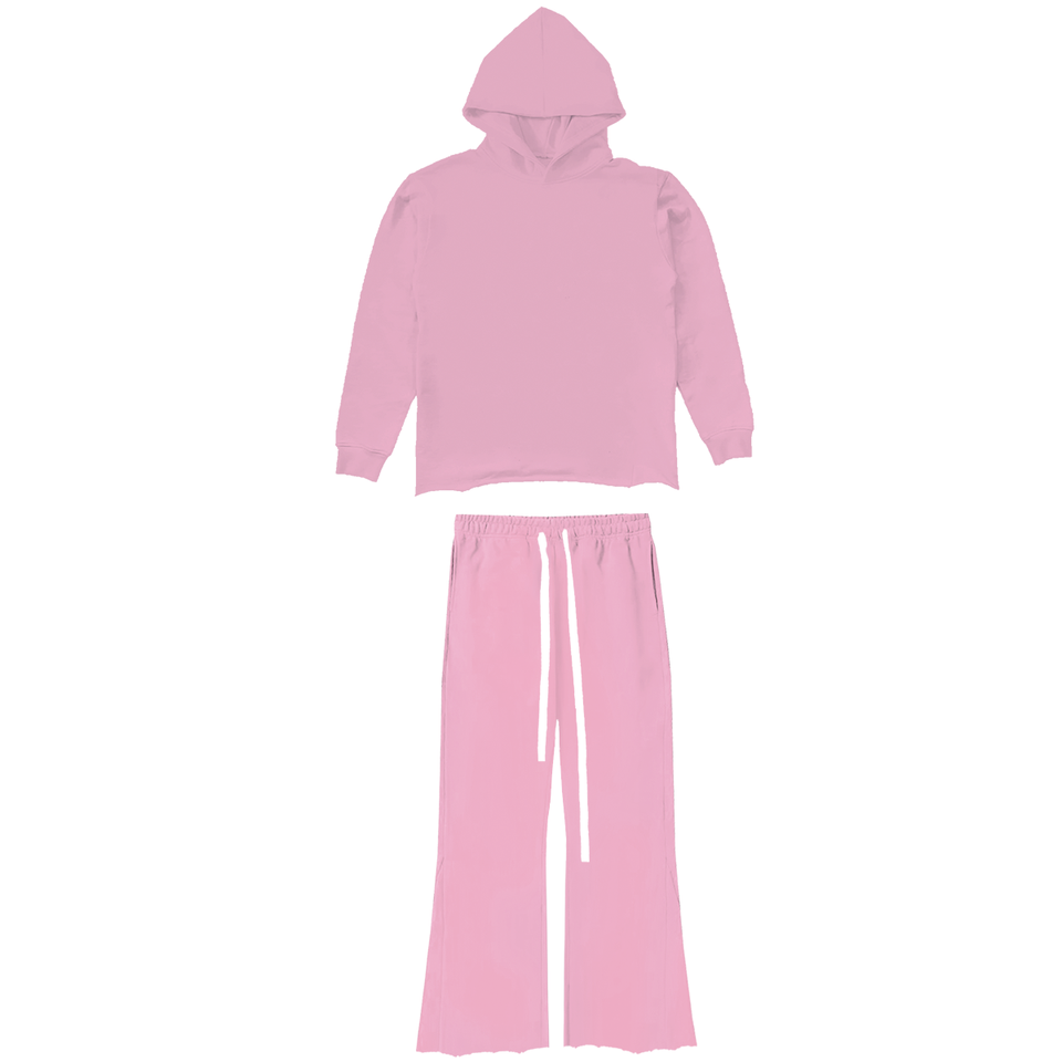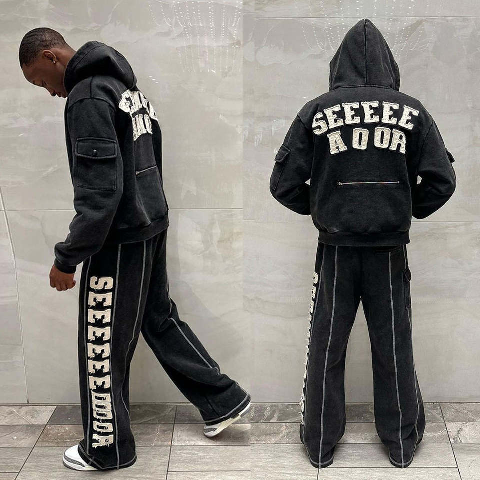 ชุดเซ็ตเสื้อฮู้ดซิปเต็มตัวพิมพ์ลายตามสั่งแบบยูนิเซ็กซ์ และกางเกงขายาวทรงสแต็ค ล้างสีแบบแอซิดวอช สไตล์วินเทจสำหรับผู้ชาย