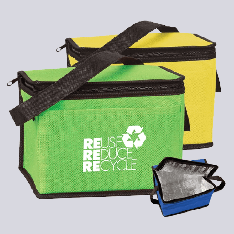 กระเป๋าเก็บความเย็นแบบพกพาสำหรับกระป๋องเครื่องดื่ม 6 กระป๋อง ผลิตจากผ้าไม่ทอ กันน้ำ เป็นมิตรกับสิ่งแวดล้อม พิมพ์ลายได้ตามต้องการ