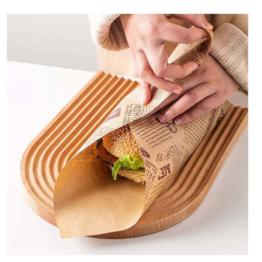 กระดาษห่ออาหารสีน้ำตาลกันน้ำ กันไขมัน พิมพ์ลายได้ตามต้องการ สำหรับบรรจุภัณฑ์เบอร์เกอร์ แซนวิช และอาหารร้อน ปลอดภัยสำหรับอาหาร