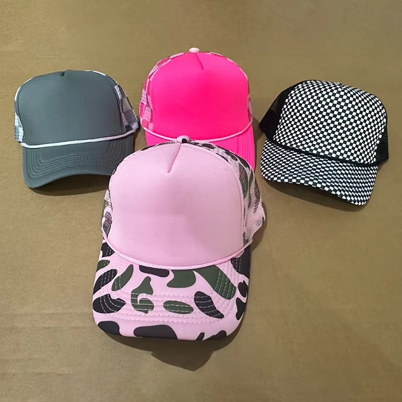 หมวกแก๊ปทรงทรัคเกอร์ 5 แผง 3 สี พิมพ์ลายตามสั่ง พร้อมโลโก้แบบกำหนดเอง ขายส่ง หมวกตาข่ายระบายอากาศสำหรับกิจกรรมกลางแจ้ง