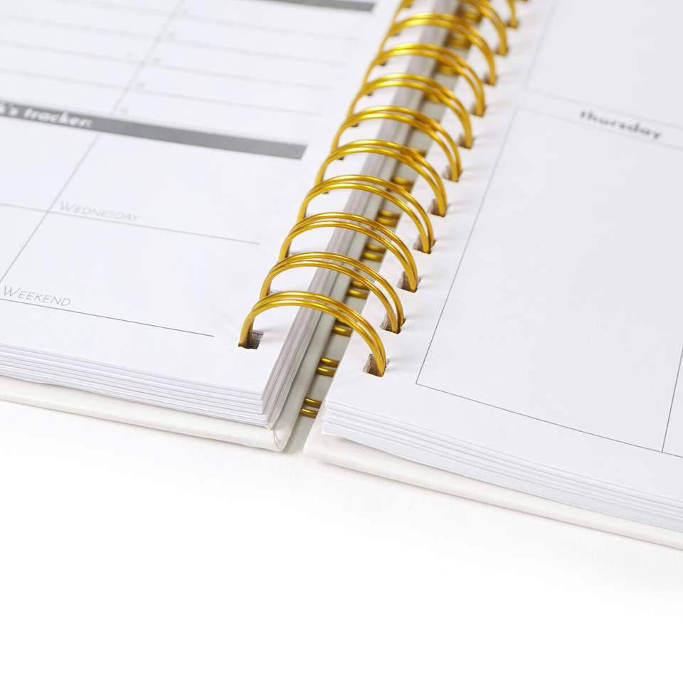 สมุดจดไดอารี่ปกแข็งแบบเกลียวเป้าหมายการดูแลตนเองรายสัปดาห์การพิมพ์ตามความศรัทธาที่กำหนดเอง