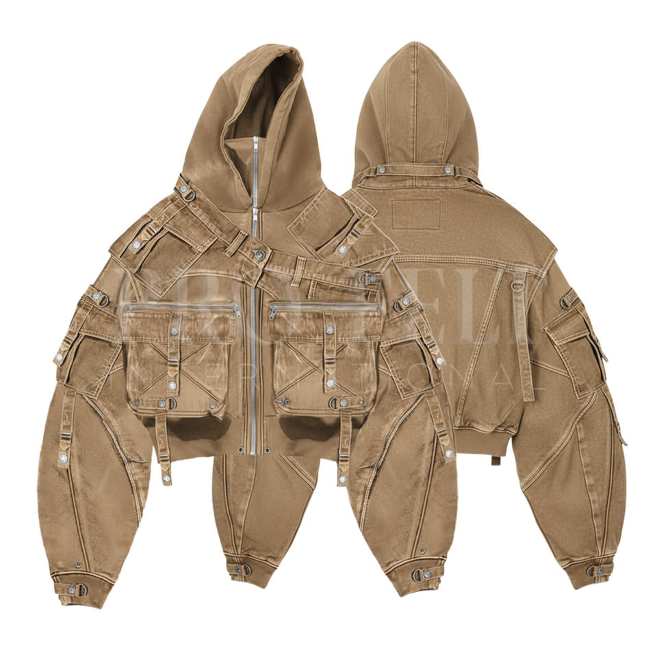 แจ็กเก็ตผ้ายีนส์คอครอปแขนยาวของผู้หญิงเสื้อฮู้ดซักได้หลายกระเป๋าแนววินเทจพิมพ์ลายได้ตามต้องการ