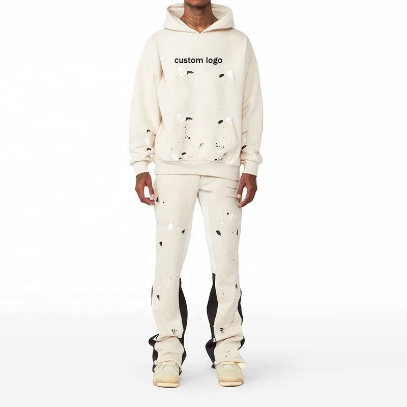 ชุดวอร์มผ้าคอตตอนผ้าฟลีซสำหรับผู้ชายชุดวอร์มกางเกงบานและเสื้อฮู้ดแนวสตรีทพิมพ์ลายตามสั่งสำหรับฤดูหนาวชุดวอร์มผ้าคอตตอน100% 450กรัม