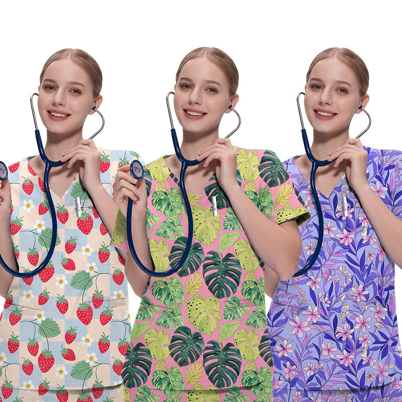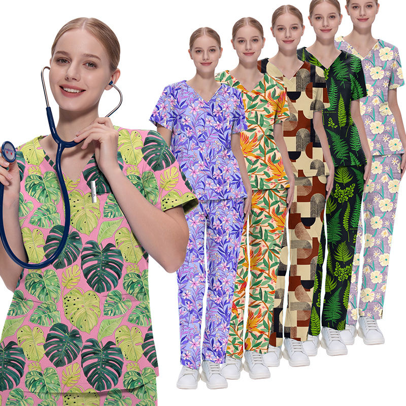 ชุดเครื่องแบบ2ชิ้นสำหรับงานพิมพ์ลายชุดเครื่องแบบพยาบาลแขนสั้นคอวีสำหรับผู้หญิง