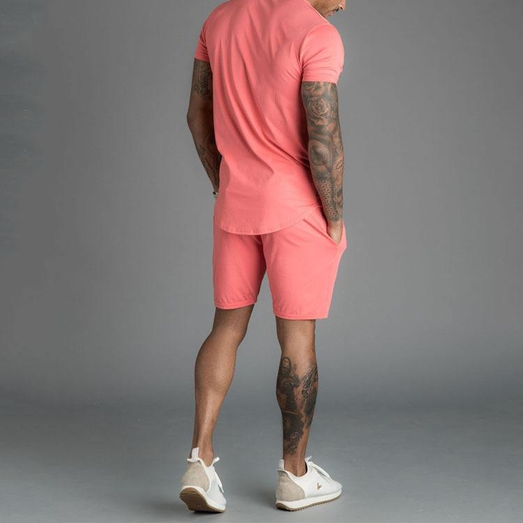 ชุดเซ็ทลำลองสองชิ้นสำหรับผู้ชาย พิมพ์โลโก้ส่วนตัวได้ เนื้อผ้านุ่มคุณภาพสูง ผลิตจากผ้าฝ้าย 100% ประกอบด้วยเสื้อยืดและกางเกงขาสั้น