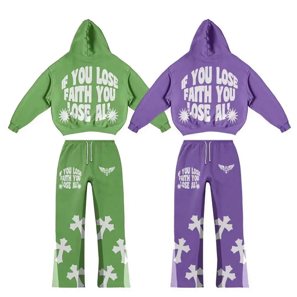 ชุดเซ็ตสเวตสูทผู้ชายผ้าเฟรนช์เทอร์รี่พิมพ์ลายพัฟฟ์แบบกำหนดเอง ชุดสองชิ้น เสื้อฮู้ดดี้และกางเกงขาบาน
