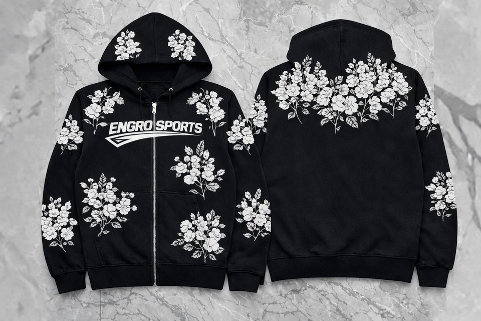 เสื้อฮู้ดพิมพ์ลายพัฟแบบกำหนดเอง – ลายดอกไม้สีขาว | เสื้อฮู้ดซิปสีดำ | ผู้ผลิต OEM เสื้อฮู้ดดีไซน์ลายดอกไม้ Snapdragon
