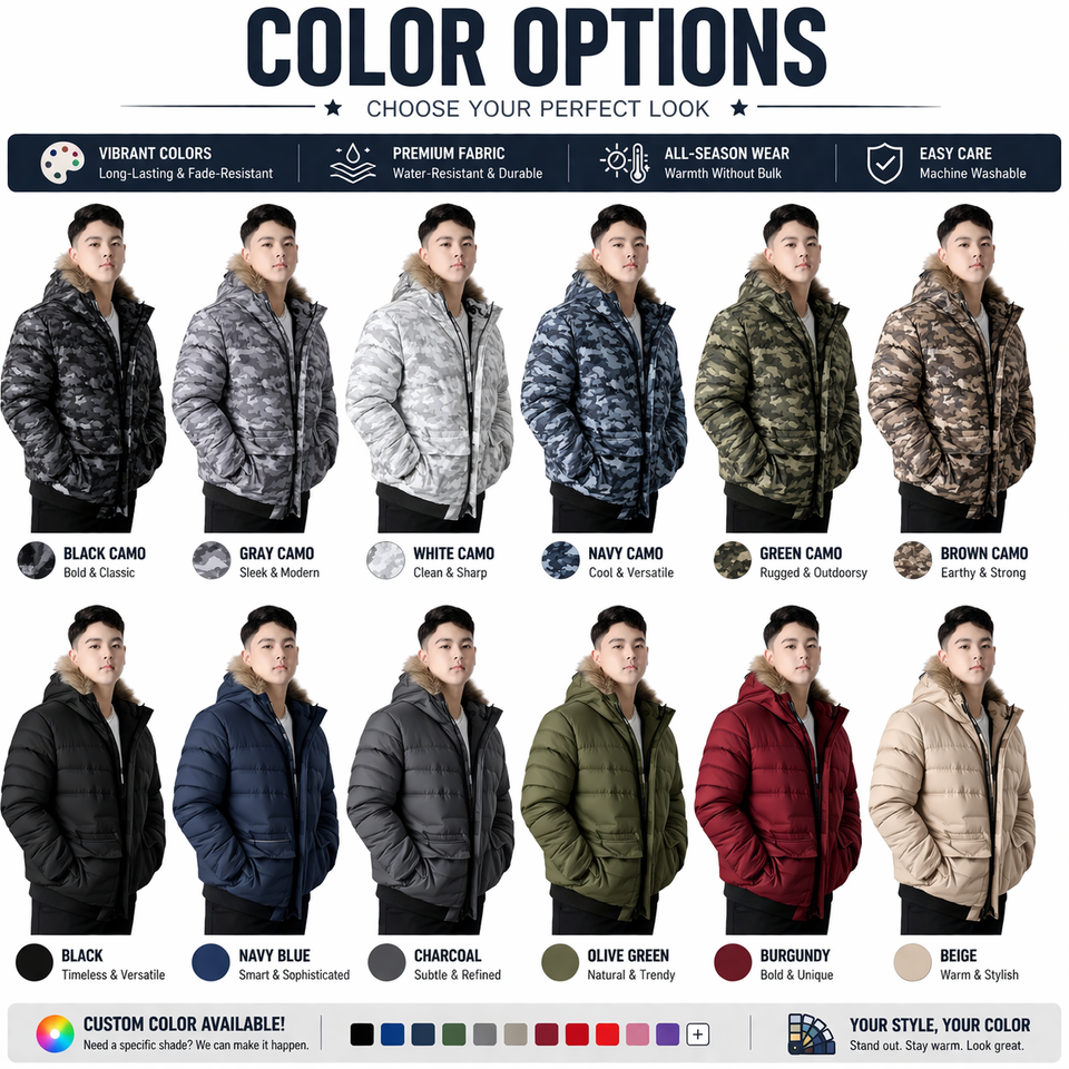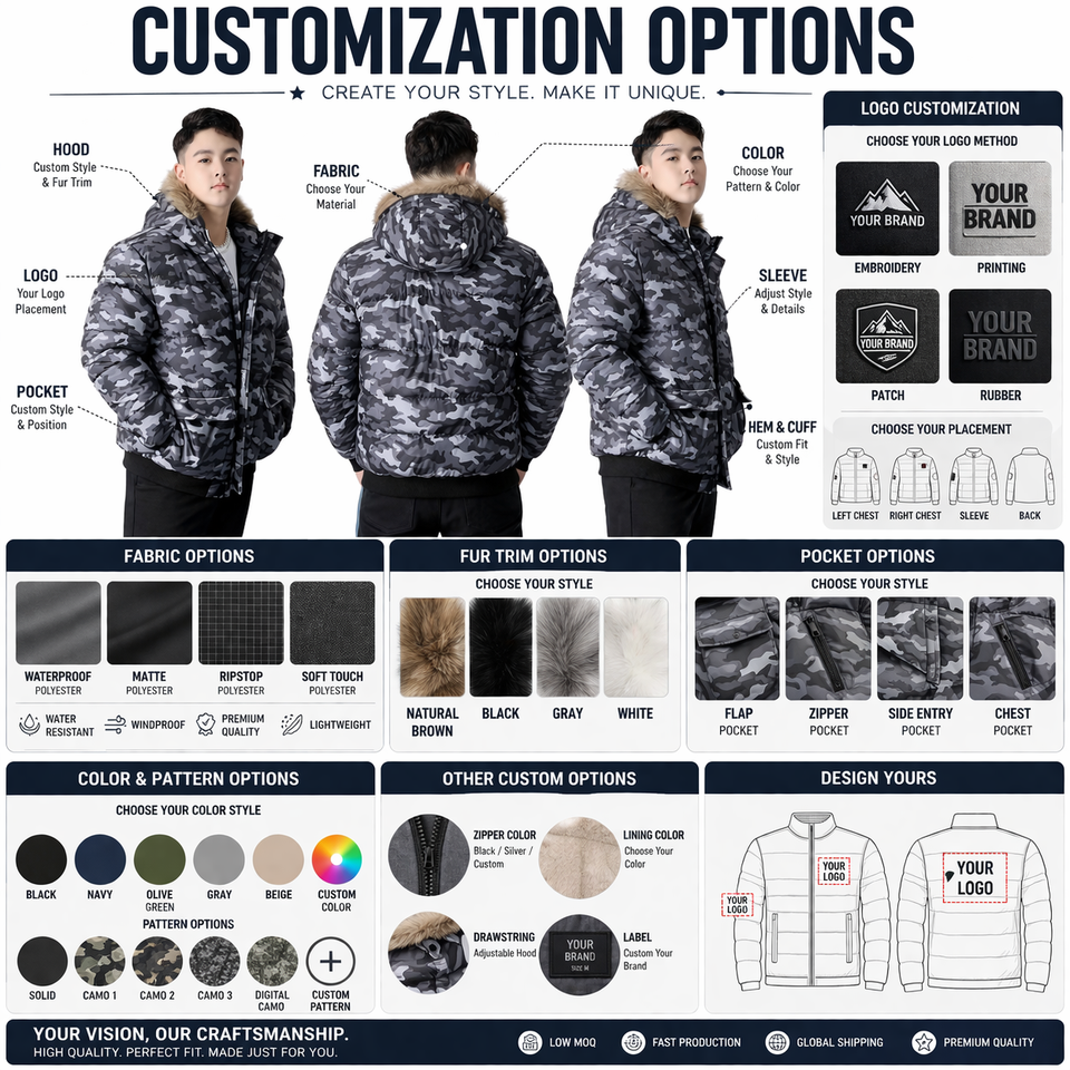เสื้อแจ็คเก็ตพัฟเฟอร์แบบกำหนดเองสำหรับผู้ชาย เสื้อโค้ทมีฮู้ดลายพรางสำหรับฤดูหนาว แต่งขอบขน กันน้ำ กันลม เสื้อแจ็คเก็ตบุใยสังเคราะห์ สกรีนโลโก้ได้ เสื้อคลุมกันหนาว