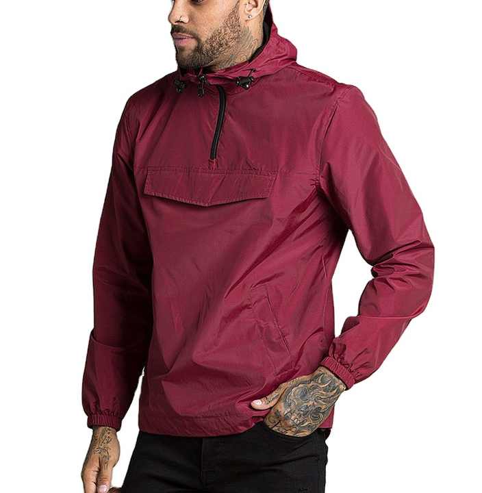 แจ็คเก็ตแบบสวมศีรษะสำหรับผู้ชายเสื้อแจ็คเก็ตกันลมมีฮู้ดมีซิปครึ่งแขนสำหรับผู้ชาย