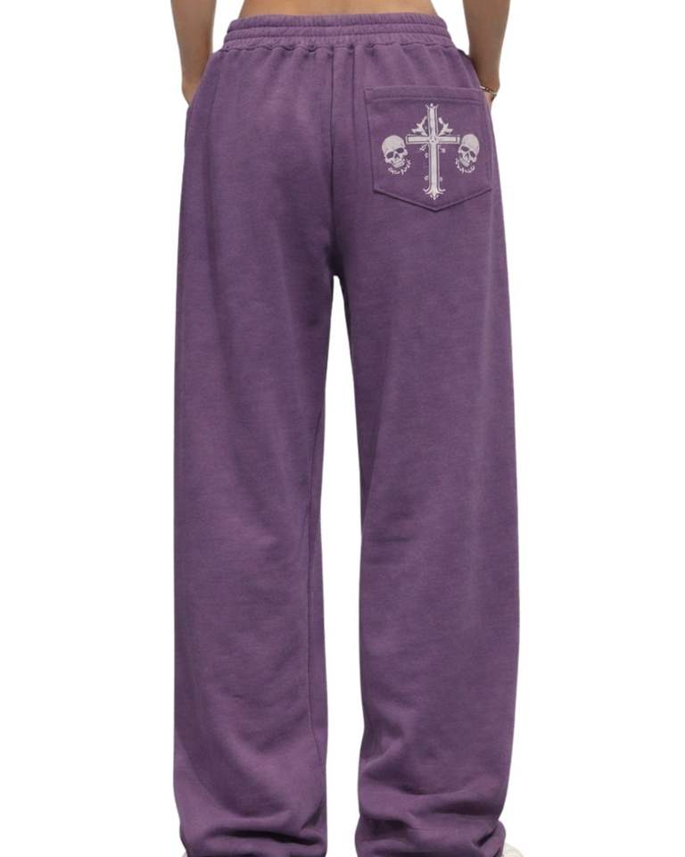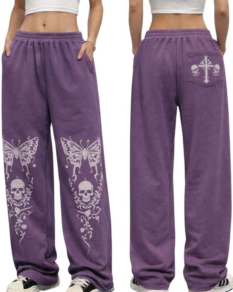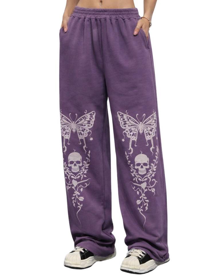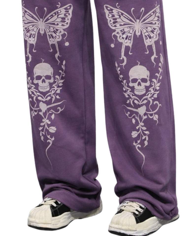 กางเกงวอร์มขายาวพิมพ์ลายหัวกะโหลกผีเสื้อสีม่วงแบบกำหนดเองสำหรับผู้หญิง สไตล์โกธิคสตรีทแวร์ทรงโอเวอร์ไซส์ ผ้าฟลีซ กางเกงจ็อกเกอร์ รับผลิตแบบ OEM ODM